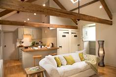 A cozy living room with a white sofa adorned with yellow and green pillows, a wooden coffee table with a book and a cup on it, and a floor lamp to the right. The room has wooden flooring, a wooden ceiling with exposed beams, and a kitchen area with a wooden countertop and cabinets. There are hanging lights above the kitchen area, and a window with a view of the outside. | The Old Cart House - Holiday Cottage - 6.2 miles NW of Kingsand | 016558481d4c4c822873100e2c6ec86d7379fc9c1e5f16defbeecf4673f2ad9b | 001065747928 | 0 | 0 | 71 | 13 | 0 | 0 | |