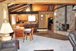 A cozy living room with a fireplace, wooden furniture, and a kitchen area with a refrigerator and sink. The room has a vaulted ceiling with exposed beams and a stone wall. There is a dining table with chairs, a couch, and a coffee table in the center of the room. | *Free Activities with Xplorie* Cozy Cabin Feel, Near the Village, Wood Fireplace, Recreation Passes -Bobcat 7 | 2df27d4b480bf3e97ede9b77b5297ad9178868da1520fb5ab770e46b150722db | 001065747991 | 0 | 0 | 50 | 16 | 0 | 0 | |