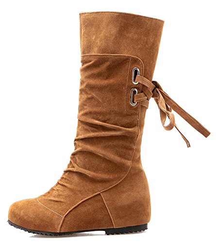 A pair of brown high-heeled boots with a pointed toe and a thick, ribbed shaft. The boots have a zipper closure on the side and a brown leather lace that wraps around the top of the shaft. The heels are high and the soles are made of a smooth, black material. | IDIFU Womens Fashion Low Wedges Heighten Faux Suede Mid Calf Boots Booties Lace Up Yellow 41TiF | 3f145f5b3b799ba28607eea93c25d172c0f8fa5f23d0133e4062b5306a3ecd1f | 001065747989 | 0 | 0 | 51 | 16 | 0 | 0 | |