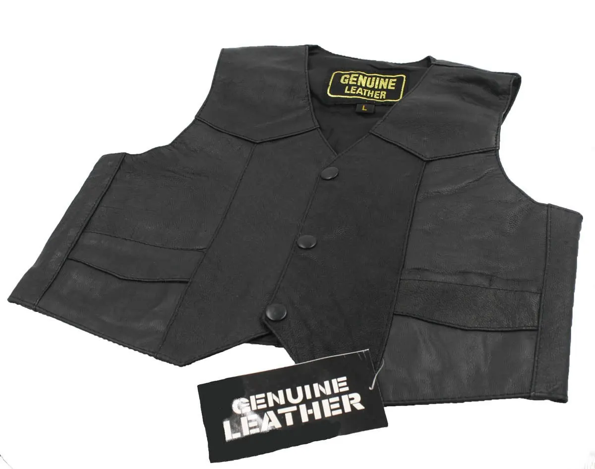 A black leather vest with a 'GENUINE LEATHER' tag on the front is displayed on a white background. The vest has a zipper closure and multiple pockets. A smaller black leather tag with the same text is placed below the vest. | Dona Michi Unisex Kids/Toddlers Genuine Soft Leather Outerwear Biker Vest | 8e86a8fabd0e18b2d8ff58aad1c3854fa994a5c66ca21c84b4de6f32c1264f33 | 001065748032 | 0 | 0 | 41 | 10 | 0 | 0 | |