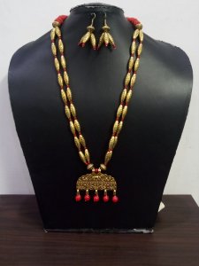 A mannequin is adorned with a gold necklace featuring a large, ornate pendant with red tassels and a pair of dangling earrings with red tassels. | Elegant Golden Dholki Necklace Set | 9d939a188846d74c11cab6e83ae8846c624f2976724703cd94fd521cc2cd523b | 001065748492 | 0 | 0 | 25 | 5 | 0 | 0 | |