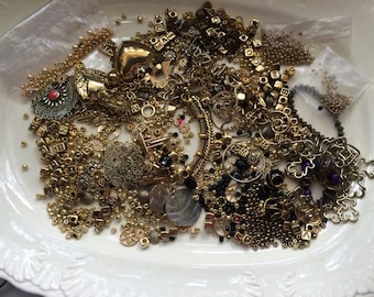A white porcelain plate is filled with various pieces of jewelry, including necklaces, earrings, and rings, all made of gold and adorned with gemstones. The jewelry is scattered across the plate, with some pieces overlapping each other. The plate has a decorative edge with a scalloped design. | Huge lot of gold jewelry making beads | b5f1cfc8766dc053811c5ae931f6be454e215579343510e01cbe93da48dbf633 | 001065748470 | 0 | 0 | 47 | 7 | 0 | 0 | |