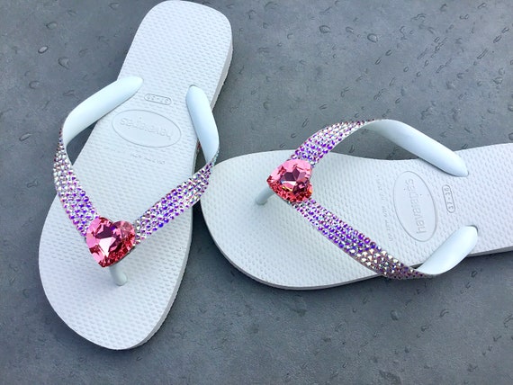A pair of white flip-flops with a pink heart-shaped charm on the left sandal and a red heart-shaped charm on the right sandal. The charms are adorned with rhinestones. | Crystal Heart Flip Flops Valentine Wedding Havaianas flat Cariris Wedge Heel Custom Reception w/ Swarovski Rhinestone Jewel Bridal Shoes | e32d1e4c4079aa2206e705f8272331600921b15cbc2222e149dff533ab461e13 | 001065748528 | 0 | 0 | 29 | 19 | 0 | 0 | |