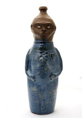 A blue ceramic vase with a textured surface and a face-like design on the front, featuring a large eye and a small mouth, is displayed against a white background. | Randy Tobias, "Large Blue Figural". Glazed And Pai | 1dda9b6f116900083615034f12f53983395c0d68568db3ea4bce4f83807e4e40 | 001065748599 | 0 | 0 | 29 | 8 | 0 | 0 | |