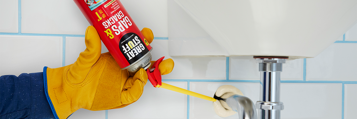 A hand wearing yellow rubber gloves is holding a spray bottle with a label that reads 'Lysol Disinfectant Spray' and is spraying it towards a white toilet paper dispenser attached to a tiled wall. | Gaps & Cracks Insulating Foam Sealant - Foam Gap Filler | GREAT STUFF\xe2\x84\xa2 | 50e346f1410c0d7a645043ce0b8032c7cf3584e35c5c8b61973f4ea4ba3ac874 | 001065748579 | 0 | 0 | 34 | 13 | 0 | 0 | |