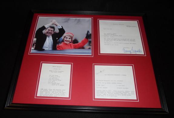 A framed collection of memorabilia featuring a photograph of a man and a woman, both waving, with the man on the left and the woman on the right. The photograph is surrounded by four certificates, each with a red border and white text. The certificates are arranged in a 2x2 grid, with the top-left and bottom-right certificates having a red background, and the top-right and bottom-left certificates having a white background. The man is wearing a black suit and the woman is wearing a red dress. The frame is black with a red matting. | Nancy & Ronald Reagan 16x20 Framed ORIGINAL 1975 Recipe Set & Photo Display | 59c4cef675ad22416a4af073bde709ba1c75d69a37bb61025016b86ae2ed4f60 | 001065748934 | 0 | 0 | 94 | 13 | 0 | 0 | |