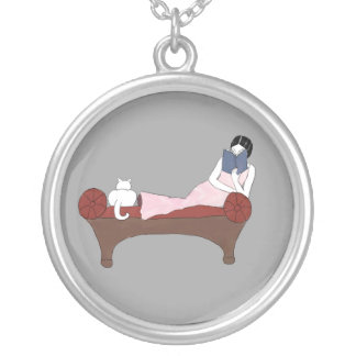 A silver pendant with a transparent background, featuring a whimsical illustration of a woman lying on a bench with a cat beside her, reading a book. The pendant is suspended by a chain. | A Lady, A Cat and A Very Good Book Necklace | 8af575f0b18cce95b223bdcdb15e5be9cc58875dce9388a9d361c1d76f51b499 | 001065748933 | 0 | 0 | 33 | 10 | 0 | 0 | |