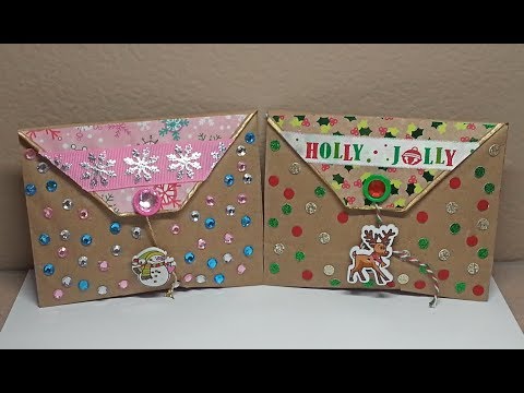 Two identical handmade Christmas cards are displayed side by side. Each card features a festive design with a red and green color scheme, adorned with snowflakes, holly leaves, and berries. The cards have a textured brown paper background and are embellished with various decorations such as glitter, stickers, and a small Santa Claus charm. The cards are attached to a white surface with a small metal clip. | DIY~Cute Christmas Chocolate & Coffee Treat Pouch Made From Paper Bag! | ab379b93a3d462b1abf3bba2ccb89310b9216598cf1a043699c745223a108276 | 001065749044 | 0 | 0 | 67 | 11 | 0 | 0 | |