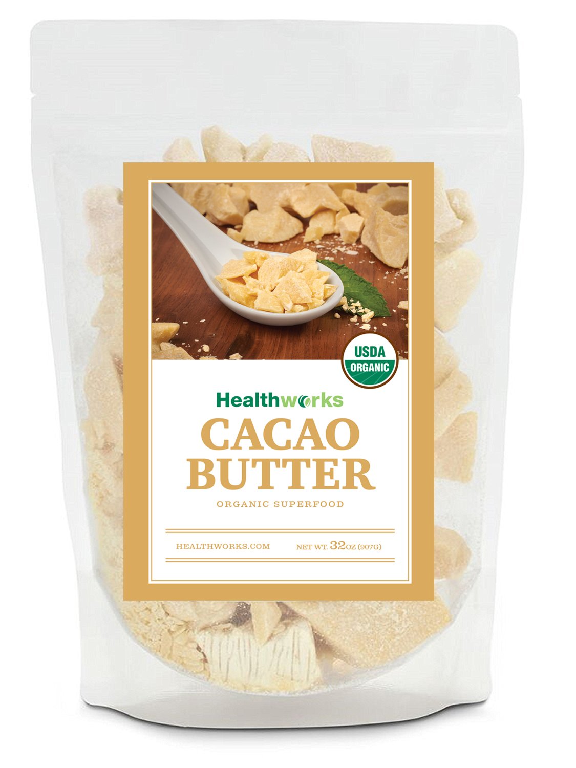 A bag of cocoa butter with a spoonful of cocoa butter on top, placed on a wooden surface. The bag has a label that reads 'HEALTHWORKS ORGANIC' and 'COCOA BUTTER ORGANIC SUPERFOOD'. The cocoa butter appears to be in a crumbly form. | Healthworks Cacao Butter Organic, 2lb | 609caf8b97545aad22d8866856b8d10898633f80cc76ae099c75d13f30974f59 | 001065749086 | 0 | 0 | 42 | 5 | 0 | 0 | |