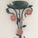 A decorative vase with a floral design is mounted on a wall. The vase has a green base and a pinkish hue with a textured surface. It is adorned with pink flowers and green leaves, and there are three pink flowers with green leaves hanging from the bottom of the vase. The wall behind the vase is a light color, and the overall scene is well-lit. | Green & pink floral metal wall sconce in an art nouveau style | 08e3d35a8f964d247fe71c135b302a3f4934302b2faae399963216b7c77e71da | 001065748849 | 0 | 0 | 66 | 12 | 0 | 0 | |