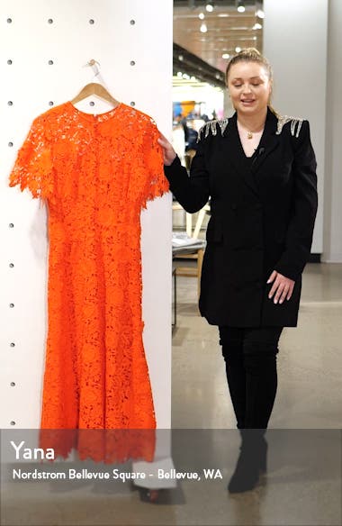 A woman in a black blazer and black pants is standing next to a mannequin wearing an orange dress with a label that reads 'YANA' and 'NORDSTROM BELLEVUE SQUARE - BELLEVUE, WA'. The mannequin is displayed in a store with a white wall and a wooden floor. | Flutter Sleeve Lace Midi Dress, sales video thumbnail | c96ca6b8720e26415218aa487c91d84dcb25d6dca540713804aa515a59898c1f | 001065749149 | 0 | 0 | 47 | 8 | 0 | 0 | |