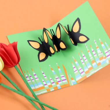 A paper butterfly with black and yellow wings is perched on a green paper flower, which is part of a larger paper flower arrangement. The arrangement is on a green background with a gradient to orange at the bottom. The paper flowers have a striped pattern in various colors. | Butterfly Pop Up Card Paper Craft | bc6831b72abf888619fe75aa82db3587e3a753570011490a774a397357dba6e5 | 001065749129 | 0 | 0 | 49 | 6 | 0 | 0 | |