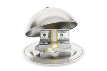 A stack of US dollar bills is placed on a silver plate with a metallic silver lid covering it. The lid has a curved shape and is positioned over the stack of bills, which are arranged in a neat pile. The plate has a circular pattern with raised edges and is set against a white background. | Silver Restaurant Cloche With Dollars Banknotes | fad33aa4546c4463cc586205314cc0d0082aa323ecee940dc96d68bc451729f4 | 001065749564 | 0 | 0 | 56 | 6 | 0 | 0 | |