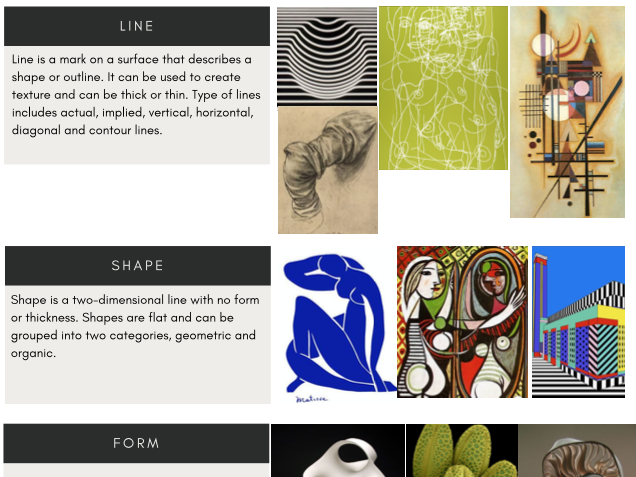 A collection of abstract art pieces with descriptive text below each one. The text describes the art as 'line','shape', 'form', and 'organic'. The art pieces include a variety of styles and colors, with some featuring geometric shapes and others with more fluid, organic forms. | Elements of Art | e7cbc52a0bfa504507caebc7aad56c32b552350f585911e0192bc10e29562150 | 001065749614 | 0 | 0 | 44 | 3 | 0 | 0 | |