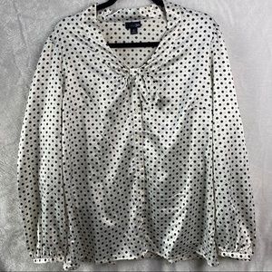 A white blouse with a black collar and a black bow tie at the neckline is displayed on a hanger. The blouse has a polka dot pattern and is made of a shiny fabric. | East 5th Polka Dot Button Down Blouse | 8ad8e6528cdba16a55cdf1aff65a59ea1af3072440c04a0dfc341cf3b5316fbd | 001065749641 | 0 | 0 | 34 | 7 | 0 | 0 | |
