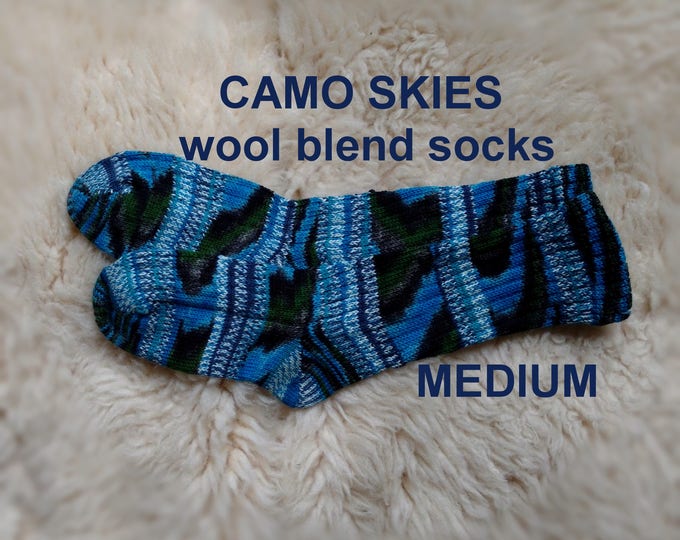 A single blue and green striped sock with the text 'Camo Skies Wool Blend Socks Medium' is placed on a white furry surface. | Camo Skies Socks --- washable wool blend --- MEDIUM | 659e23a01759ebc56eab8bf099465627094c0a8d3031476748c0b55c73cad0db | 001065749608 | 0 | 0 | 23 | 9 | 0 | 0 | |