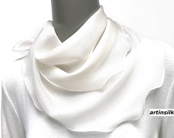 A close-up of a white knitted scarf with a textured pattern, draped over a mannequin. The scarf has a ruffled edge and is knitted in a way that creates a series of small, rounded loops. The mannequin is wearing a white top with a similar textured pattern, and the background is a plain, light color. | Silk Crepe Scarf Square Neck Kerchief, Petite Natural white, S 20x20", One of a kind, Artinsilk | 3e2de90e1fc6d8f144d97590d049e6e89cef7ab4f82f26edf981850eacac8cb1 | 001065749570 | 0 | 0 | 55 | 16 | 0 | 0 | |