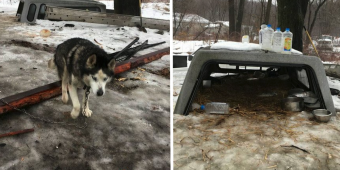 A husky dog is standing on a snowy ground with a metal structure in the background. The structure has a metal roof and is surrounded by snow. There are various items on top of the structure, including bottles and a bowl. The dog appears to be looking at the structure with interest. | After 15 Years On A Chain In The Worst Conditions, Husky Finally Learns How To Be A Real Dog | 59003d41cf0908eb4fb7091a4dd5e8ea621183e1752d7b0f57138630e0a32fc9 | 001065749626 | 0 | 0 | 52 | 19 | 0 | 0 | |