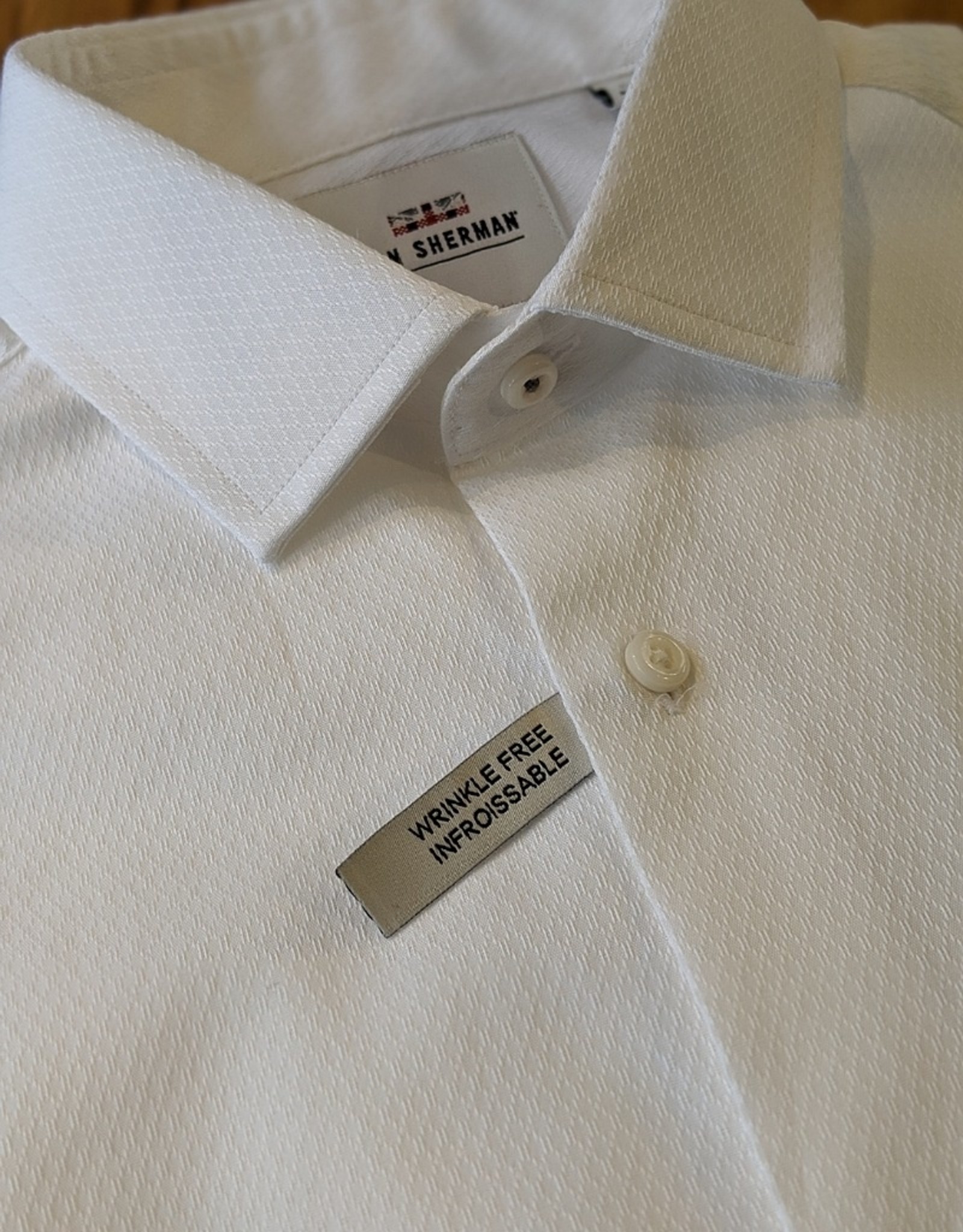 A white dress shirt with a collar and a buttoned placket. The shirt has a label on the upper left side that reads 'Sherman' and a tag on the lower right side that says 'Wrinkle Free'. The fabric appears to be smooth and the shirt is neatly pressed. | Ben Sherman Ben Sherman Slim Fit Dress Shirt | ceff3aad9190c2776358e97fd0bf94d8a9dc038ca74fd2e93615113b197ea2ce | 001065749825 | 0 | 0 | 48 | 8 | 0 | 0 | |