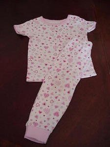 A pink child's t-shirt with a floral pattern and heart designs is laid out on a dark wooden surface. The shirt has a round neckline and short sleeves. The floral pattern consists of small pink flowers with green leaves, and there are several heart-shaped designs in various sizes scattered across the shirt. The shirt appears to be a size suitable for a young child. | Just One Year division of Carter's Pajamas or PJs Size 12 Months box11 | 460018cf52797c7becdee64870659682ab42d968c5b1cdbba53483429d01dedb | 001065749893 | 0 | 0 | 64 | 13 | 0 | 0 | |