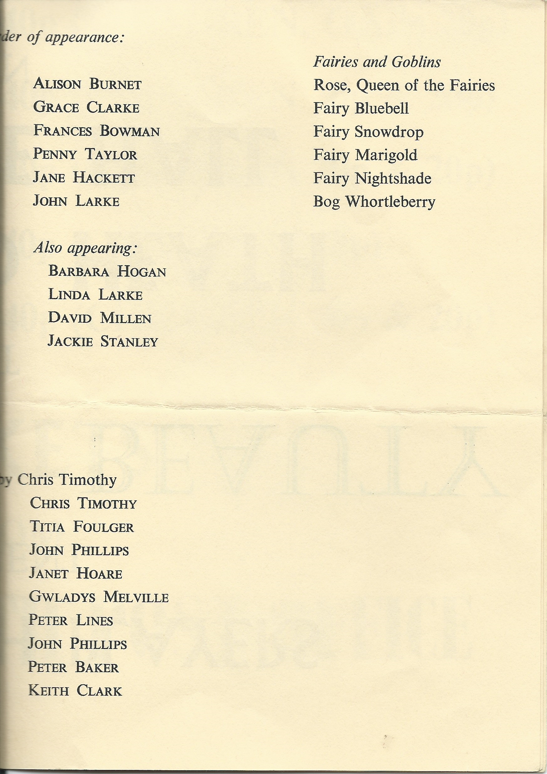 A page from a program listing the names of performers in a play. The names are arranged in two columns, with the left column containing the names of the male performers and the right column containing the names of the female performers. The names are listed in a formal font, and the page appears to be aged with some wear and tear. | Programme 3 | 0b7dae2d2ce7e4f4331028298707be2900c75398175b78a2fe69f3e121b0301b | 001065749906 | 0 | 0 | 62 | 2 | 0 | 0 | |