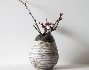 A rustic vase with a textured surface and a pattern of horizontal lines sits on a white surface. The vase contains a branch with a few pink blossoms and some bare twigs. The background is a plain, light-colored wall. | Striped nericomi stoneware vase | ffe8a537a151f5666486f1482dcfc7de29e06b78ba0ccbeba1a6b97dad7d2554 | 001065749994 | 0 | 0 | 39 | 4 | 0 | 0 | |