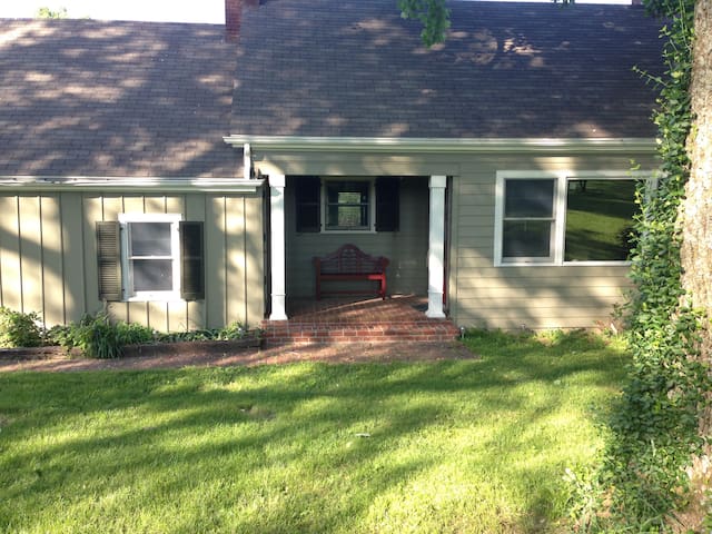 A quaint house with a red front door and a white porch is surrounded by a lush green lawn. The house has a gray exterior with white trim and a dark roof. There is a red bench on the porch, and the scene is bathed in warm sunlight. | Horse Farm Cottage near Keeneland - Lexington - Talo | ec5d6d6f4236b0abc23b39ad16c594bf59e2e8d1af94adc237f691a46c204b8e | 001065750696 | 0 | 0 | 48 | 9 | 0 | 0 | |