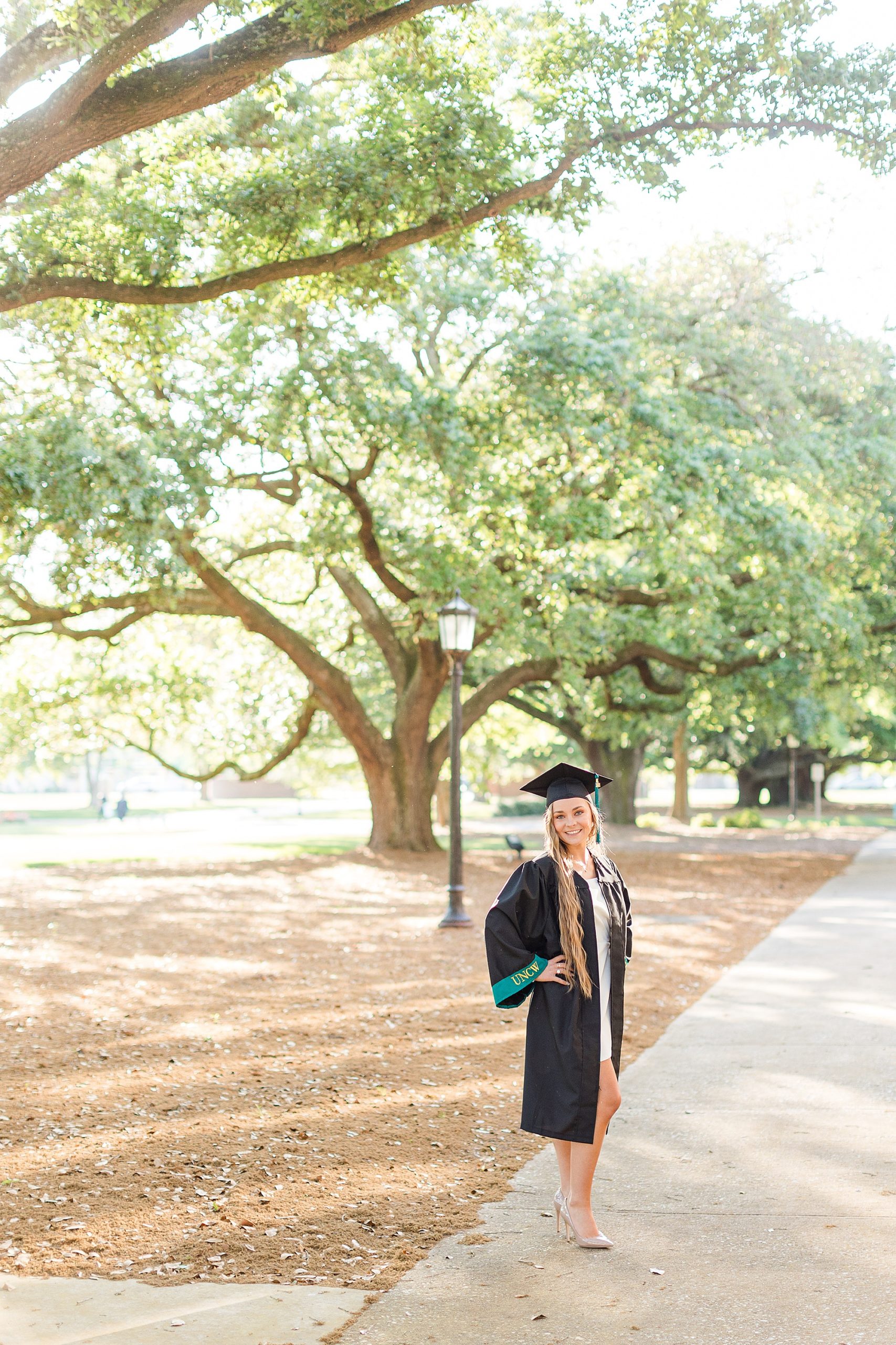 A young woman in a black graduation gown and cap stands on a pathway surrounded by lush green trees. She is holding a green object in her right hand and has a graduation sash draped over her left shoulder. The scene is illuminated by natural sunlight filtering through the foliage. | UNCW Senior Graduate Photos on UNCW campus | 5eb3e141a85ad652186ce0ef529221961ac39b43cb343337e888d92669d8ef0e | 001065750753 | 0 | 0 | 50 | 7 | 0 | 0 | |