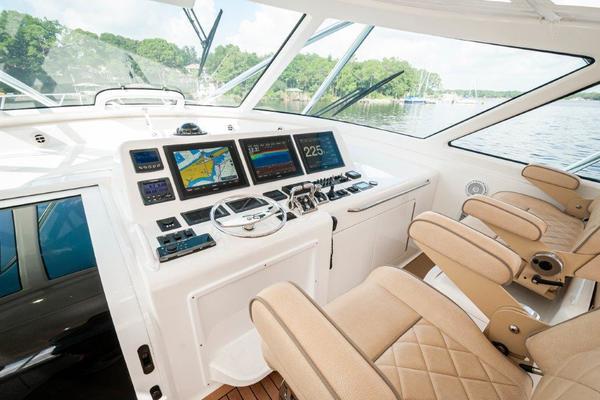 The interior of a modern yacht with a white and beige color scheme. The yacht features a large windshield with a view of the water and trees in the background. The interior is equipped with multiple navigation screens, a steering wheel, and comfortable beige seats with diamond-patterned upholstery. The yacht has a sleek design with wooden flooring and a clean, uncluttered look. | 2015 Viking 52 Open Galley | 1b4eb6dcd5f3f281c36a97a9e2aeca3035ea5a9c9cb0633836ceb61789ed575e | 001065750750 | 0 | 0 | 62 | 5 | 0 | 0 | |