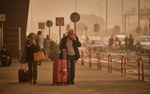 A man and a woman are walking on a sidewalk with a red suitcase between them. The man is wearing a blue jacket and the woman is wearing a black coat. They are both carrying handbags. There are multiple traffic signs and a barrier along the sidewalk. The scene appears to be hazy, possibly due to fog or smoke. | Canary Islands sandstorm: British holidaymakers stranded at airports after Saharan dust clouds wreak havoc | 3469f64f7655493da8d9b0b29d363cb549bad9e9f29972a8ac24701c42a65a47 | 001065751050 | 0 | 0 | 59 | 14 | 0 | 0 | |
