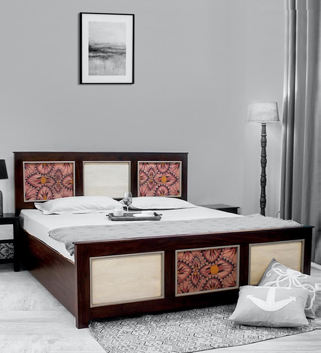 A modern bedroom with a large bed featuring a wooden headboard and footboard with intricate carvings. The bed has a white duvet with a patterned throw blanket. Above the bed, there is a framed picture on the wall. To the right of the bed, there is a wooden nightstand with a lamp and a small decorative item on top. In front of the bed, there is a patterned rug on the floor, and to the right of the bed, there is a gray pillow with a white arrow design on it. | Buy Andros King Size Bed With Storage Bed Walnut Finish By Fabuliv Online Traditional King Size Beds Beds Furniture Pepperfry Product | 2a9c1be66fea3d7ff9faba9cadd535e7bc50150467affaf92a5ca70a3362956e | 001065751039 | 0 | 0 | 91 | 21 | 0 | 0 | |