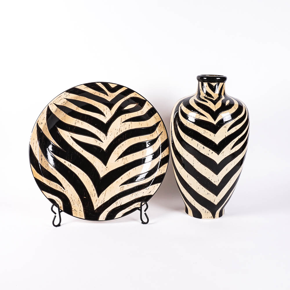 A black and white zebra print plate and a black and white zebra print vase are displayed on a white background. | Zebra Print Over Sized Charger And Vase Ebth | 72208c885db4358b1277286298b7e29229af46884a5056f66ec5d7ee031693d0 | 001065751171 | 0 | 0 | 21 | 8 | 0 | 0 | |
