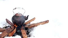 A black teapot with a silver handle and spout is sitting on a wooden log in a snowy landscape. The log is surrounded by snow, and there are no other objects or people in the scene. | Copper kettle boiling over open fire in snow Stock Footage | ac13ec3645549345a81f41c64e7a5c85cb048b3bd6485409aa48b995d55d797a | 001065751157 | 0 | 0 | 36 | 10 | 0 | 0 | |