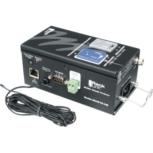 A black electronic device with a white label that reads 'HACK' is displayed on a white background. The device has several ports and connectors, including USB ports, Ethernet ports, and a power input. There is a coiled black cable with a connector attached to the device, and a small blue and white box with a label that reads 'HACK' is also present. | Middle Atlantic RLNK-SW215-NS RackLink 15 A Inline Power Switch | efc00a80e3ce0e16a20e6d52c8c2a445c811902acc07fceb1092a214e7cfd245 | 001065751250 | 0 | 0 | 62 | 9 | 0 | 0 | |