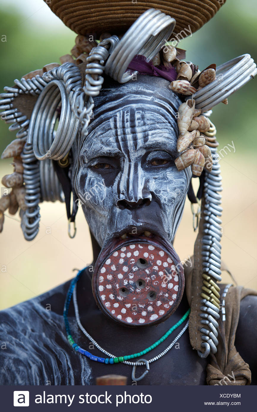 A person with elaborate tribal face paint and a large, circular, ornate piece of jewelry in their mouth. They are wearing a woven hat and multiple necklaces. The background is blurred, with hints of greenery and a clear sky. | The Mursi woman - Stock Image | 724f1dd5927f936ae1192838e73fa651000560dac1ccfa8bcb24b267fec59837 | 001065751492 | 0 | 0 | 39 | 6 | 0 | 0 |