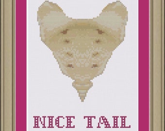 A pixelated image of a cat's head with a pink background. The cat's head is composed of various shades of brown and white pixels, resembling a cross-stitch pattern. The image is framed with a pink border at the top and bottom, and a brown border on the left and right sides. The word 'Nice' is written in red, stylized letters at the bottom of the image. | Nice tail: funny sacrum anatomy cross-stitch pattern | 831e0c38279f6e50200c5e49dacf3a37c4641fa835d136a8c75cde383ef25f31 | 001065751207 | 0 | 0 | 66 | 7 | 0 | 0 | |