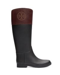 A pair of black leather boots with a brown leather trim around the top edge and a brown leather logo patch on the side. The boots have a smooth, glossy finish and are displayed against a white background. | Tory Burch - Black Classic Rainboot - Lyst | bfb6ab1045c22ec3dfad6cb1092f942cd4ef1a5abddaeeb8c2d81868588a4788 | 001065743447 | 0 | 0 | 38 | 8 | 0 | 0 | |