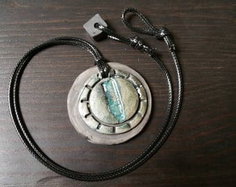 A black leather necklace with a silver pendant featuring a turquoise stone is lying on a wooden surface. | Blue Grey 1.75 inch diameter Ceramic Raku Circle Sun Pattern Pendant Necklace on 1.5mm Waxed Cord 20 inches with Raku Bead Loop Clasp | b8d5a7c73c219c63e525ae9144e1e01419fd4217b890944eee81f613683a1554 | 001065743383 | 0 | 0 | 18 | 23 | 0 | 0 | |