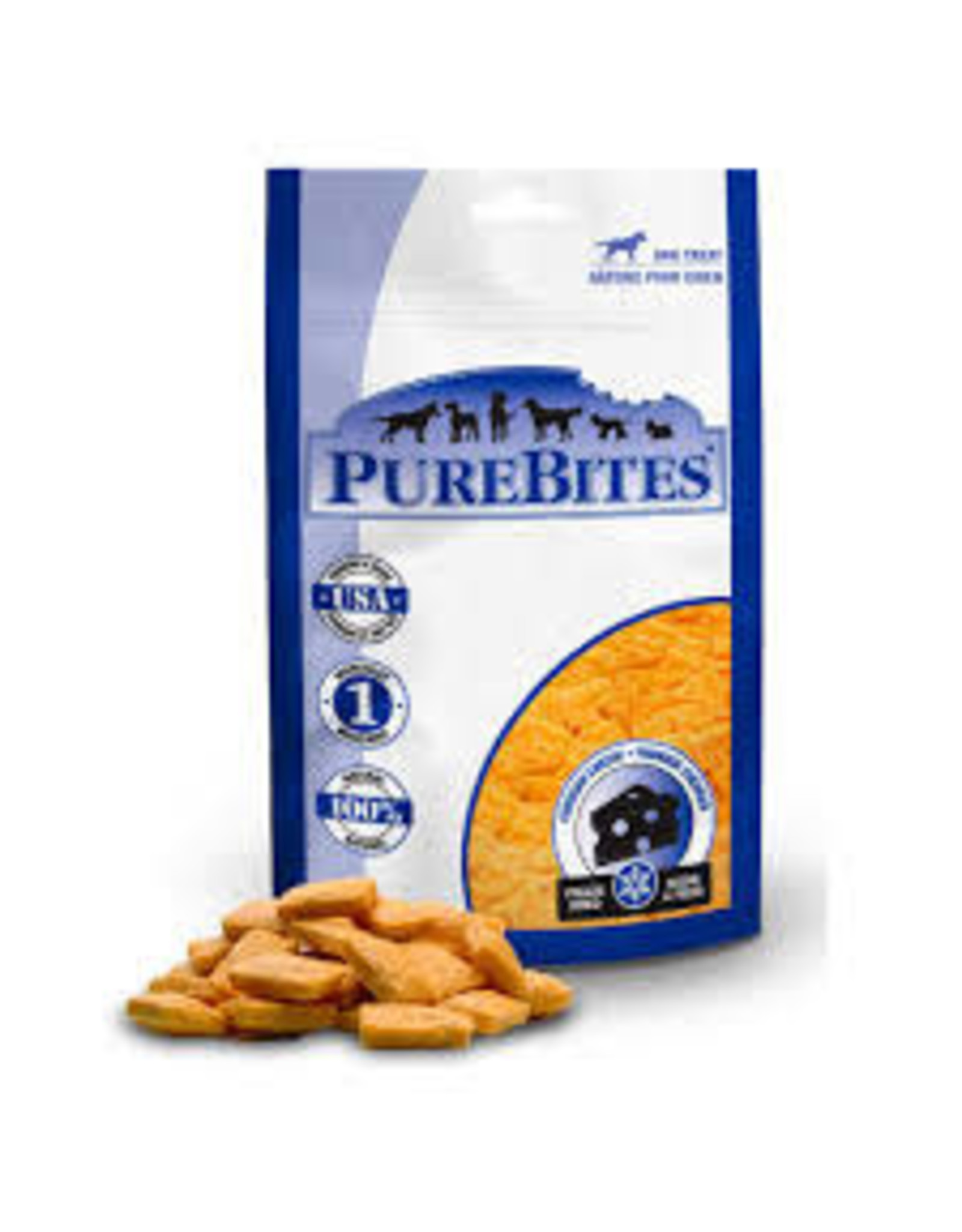 A bag of Purebites dog treats is displayed with a few treats scattered in front of it. The bag features a blue background with a white border and a mountain landscape with three dogs in the center. The brand name 'Purebites' is prominently displayed in white letters, and there are three logos on the bag, each with a different number: '1', '2', and '3'. The treats in front of the bag are golden in color and appear to be a mix of shapes and sizes. | Pure Bites Pure Bites - Cheddar Cheese 250g | 0d9e4bb0cbfa724635222bd71f35f3af832f28771a783b428945ec1e71d35d98 | 001065751835 | 0 | 0 | 85 | 8 | 0 | 0 | |