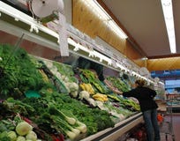 A woman is standing in a grocery store, reaching out to select a bunch of green vegetables from a display. The store has a wooden ceiling and fluorescent lights overhead. The display case is filled with various vegetables, including broccoli, cauliflower, and leafy greens. The woman is wearing a black jacket and blue jeans. | Produce Aisle. Vegetable aisle ina supermarket royalty free stock image | f936bf54c78a7233c9b82c7f9d5e9e280ab8975c51452792d2427de44383f54b | 001065751950 | 0 | 0 | 54 | 10 | 0 | 0 | |
