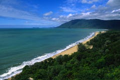 A serene beach scene with a clear blue sky and fluffy white clouds. The ocean is calm with gentle waves lapping onto the sandy shore. A lush green hillside with dense foliage rises up from the beach, and the distant mountains are partially obscured by the clouds. | Queensland, Australia Coastline Stock Images | 2950957d7b9986ea6ad591504f2024aac3967dd3a1827f9f37a7191c594c1875 | 001065751969 | 0 | 0 | 47 | 5 | 0 | 0 | |