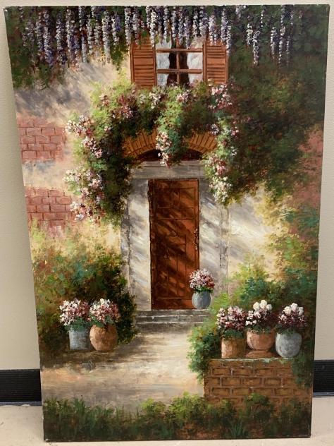 The first image depicts a painting of a charming house entrance with a wooden door flanked by two potted plants with flowers. The house has a brick facade with a white trim around the door and windows. Above the door, there is a window with a white frame, and the roof is not visible. The scene is set against a backdrop of a clear sky, and the overall color palette is warm with shades of brown, green, and white. | Signed Oil Painting of a Cottage W Flowers | 40acd32e9d53afc9283d25aaee10af4bb8cbb2fd6d966d4ddfd9dd28469f9dbf | 001065752498 | 0 | 0 | 79 | 8 | 0 | 0 | |