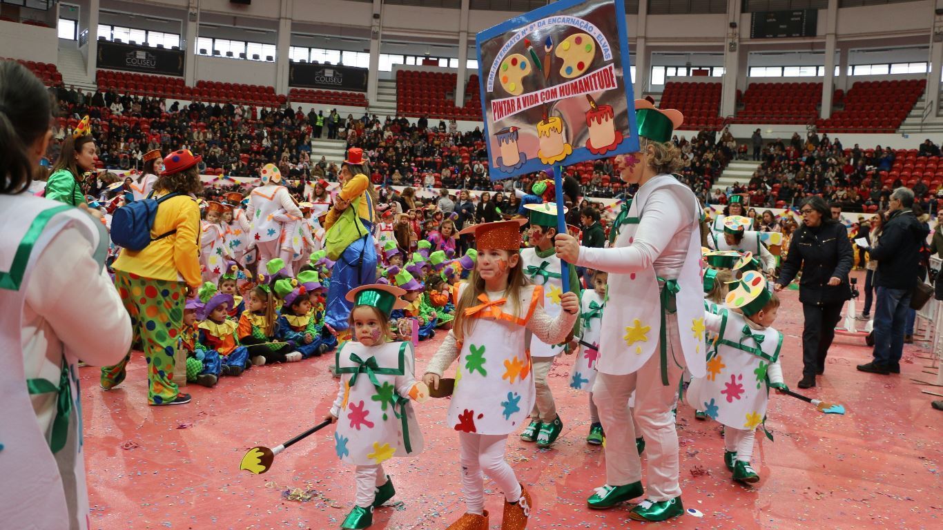 A group of people, including children and adults, are dressed in colorful costumes and are holding signs. They are gathered in a large indoor space with a crowd of spectators in the background. The people in the foreground are wearing costumes with various patterns and colors, and some are holding signs with cartoon characters on them. The spectators in the background are watching the event, and there are chairs and a red wall visible in the scene. | Carnaval Infantil | 980c1cfdb8afe5b7127b7cd71337006e9112790e3b04ae189d6b464c9b5379c7 | 001065752303 | 0 | 0 | 77 | 2 | 0 | 0 | |