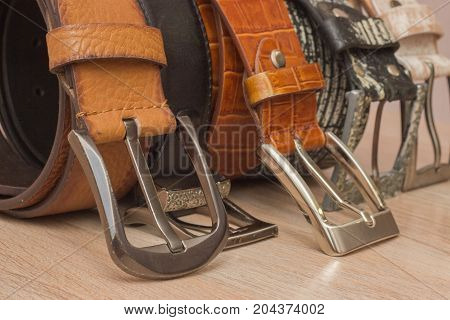 A collection of belts with different patterns and colors is displayed on a wooden surface. The belts are arranged in a way that the buckles are visible, and the belts are not attached to any belt loops. The buckles are of various designs, including a crocodile pattern and a simple metal buckle. The belts are laid out in a way that the buckles are facing upwards, and the belts are not hanging from any hooks. | men's leather belt with a buckle on a wooden board | 492d05e7fae5182f6be26e9ced852c896c95799807b430318910ac04c0c50786 | 001065752394 | 0 | 0 | 75 | 10 | 0 | 0 | |