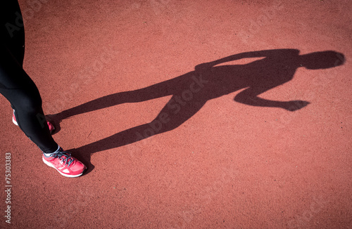 A person is jogging on a track field with a clear shadow cast behind them. The person is wearing a black outfit and red running shoes. The track field has a red surface, and there is a water bottle placed on the ground to the right of the person. | Fototapeta photo of shadow of running woman on running track | 06cd59b4f8f0177dd4188b0da58aeaf5cea099ece845f51e317fd21355bf0917 | 001065752459 | 0 | 0 | 49 | 10 | 0 | 0 | |