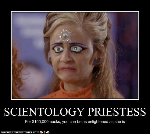 A woman with a hairstyle resembling a pyramid on her head, wearing a bright orange top with a star pattern, and a necklace with a large pendant. She has a green eye on her left eye and a blue eye on her right eye, giving her a unique appearance. The image is captioned 'Scientology Priestess for $10,000 bucks, you can be as enlightened as she is.' | scientology strangers with candy amy sedaris Enlightened money - 6870972928 | cae9001d8b774aa11089353390cb5b5f4ef9de67ba9c7fd2c27f80d32961ff0e | 001065743641 | 0 | 0 | 66 | 10 | 0 | 0 | |