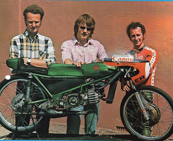 Three men are standing next to a green motorcycle with a Canon logo on the side. The man on the left is wearing a plaid shirt and has a watch on his left wrist. The man in the middle is wearing a pink shirt and has sunglasses on his head. The man on the right is wearing a red and white racing suit and is holding a Canon camera. | KREIDLER VAN VEEN, Jaap Voskamp, Jorg Moller e Jan de Vries | f84708581f362d613b9e3e0ec5738de20c2c20d7605837dde7f9570fbb424045 | 001065743534 | 0 | 0 | 69 | 11 | 0 | 0 | |