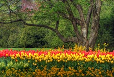 A vibrant field of tulips in various colors including red, yellow, and orange, with a large tree with green leaves in the background. | Tulip Garden. Springtime Tulip garden with blooming flowers Royalty Free Stock Photography | b2ecbab4393f71076a3ea7e0b68196fb3b4239c649e2673f92eb83508f77c25a | 001065743557 | 0 | 0 | 23 | 12 | 0 | 0 | |