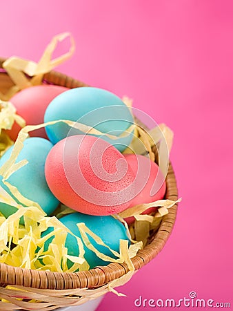 A basket filled with colorful Easter eggs is placed on a pink surface. The eggs are in various shades of pink, blue, and yellow, and they are surrounded by yellow tissue paper. The basket is woven and has a handle, and the eggs are arranged in a way that they are visible from the top. | Easter eggs | 1125e776dddd6373a5b31745760b62a19a18e493bbbd1ef630f9ad4d047b21fe | 001065743675 | 0 | 0 | 55 | 2 | 0 | 0 | |