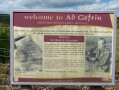 A weathered sign with a maroon background and white text reads 'Welcome to AD Gefrin' at the top. Below, there is a faded image of a person, possibly a man, with a caption that appears to be a historical description. The sign is mounted on a wooden post and is located in a rural setting with a fence and grass in the background. | Information Board | 0c71f41310525cb63206ec0367ab06148bb719a2d32c524eca64ce3bb5f061ca | 001065743603 | 0 | 0 | 63 | 2 | 0 | 0 | |